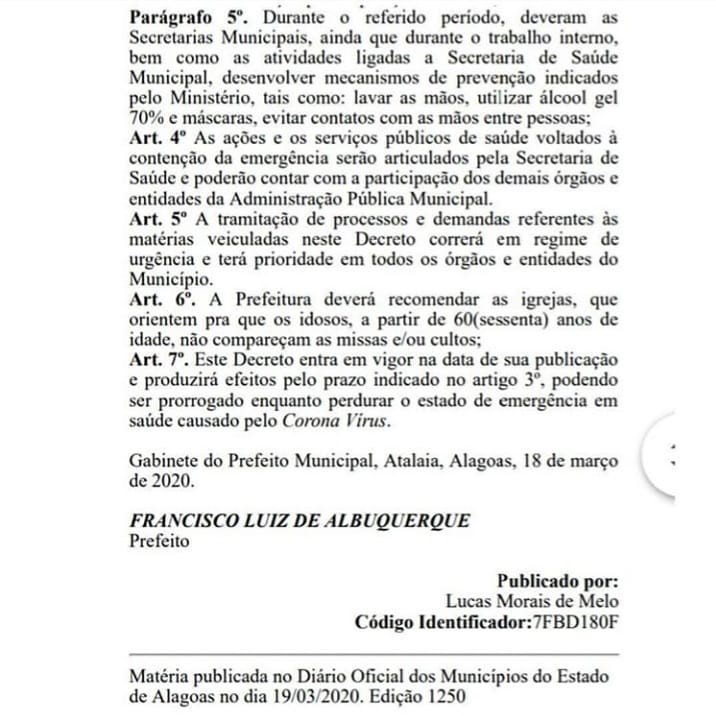 De acordo com o documento, já publicado no Diário Oficial do Município de Alagoas, ficam suspensos por 15 dias eventos de qualquer natureza com público superior a 50 pessoas, aulas da rede pública municipal / estadual e particular, o transporte universitário e limita para o público interno o atendimento na sede da Prefeitura e secretarias, excerto órgãos da Saúde.
