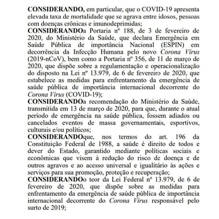 Considerando a evolução do número de casos de contaminação pelo novo coronavírus em todo o território nacional, considerando as recomendações do Ministério da Saúde e do Governo Estadual e a necessidade de aumentar as medidas restritivas temporárias para enfrentamento da emergência de saúde pública, o prefeito Chico Vigário editou um decreto nesta quarta-feira, 18 de março.