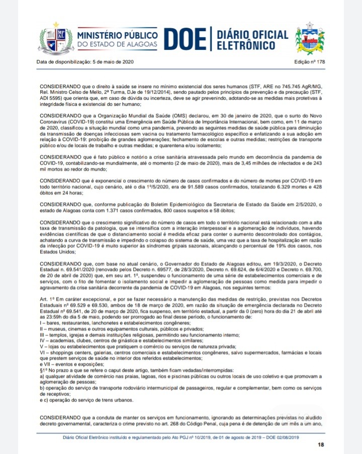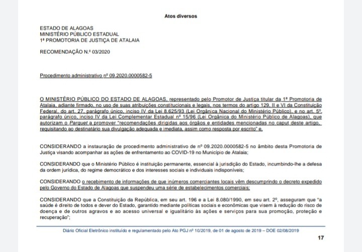 Segundo o MP, há informações de que inúmeros comerciantes locais vêm descumprindo o decreto expedido pelo Governo do Estado de Alagoas que suspendeu o funcionamento de uma série de estabelecimentos comerciais e que determina as diretrizes para o enfrentamento do novo coronavírus.
