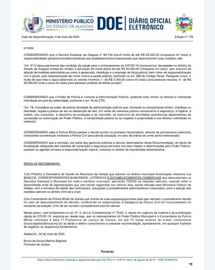 Bruno Baptista também recomenda ao Comando da Policia Militar em Atalaia que oriente suas guarnições para que realizem o procedimento devido no caso de descumprimento do Decreto, conduzindo os responsáveis à Delegacia de Policia Civil em funcionamento no momento da autuação, a fim de ser lavrado o procedimento policial cabível.