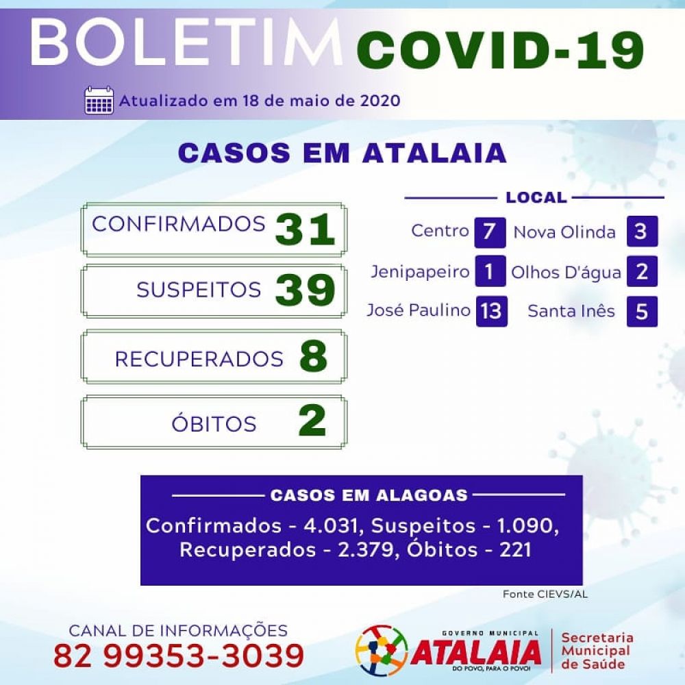 Já são 31 o número de casos confirmados da Covid-19 em Atalaia, o que faz com que o município ocupe uma incômoda 15ª colocação no ranking dos mais atingidos pela pandemia, em Alagoas. Os números foram divulgados no inicio da noite desta segunda-feira (18), no Informe Epidemiológico do Centro de Informações Estratégicas e Resposta em Vigilância em Saúde - CIEVS/AL.