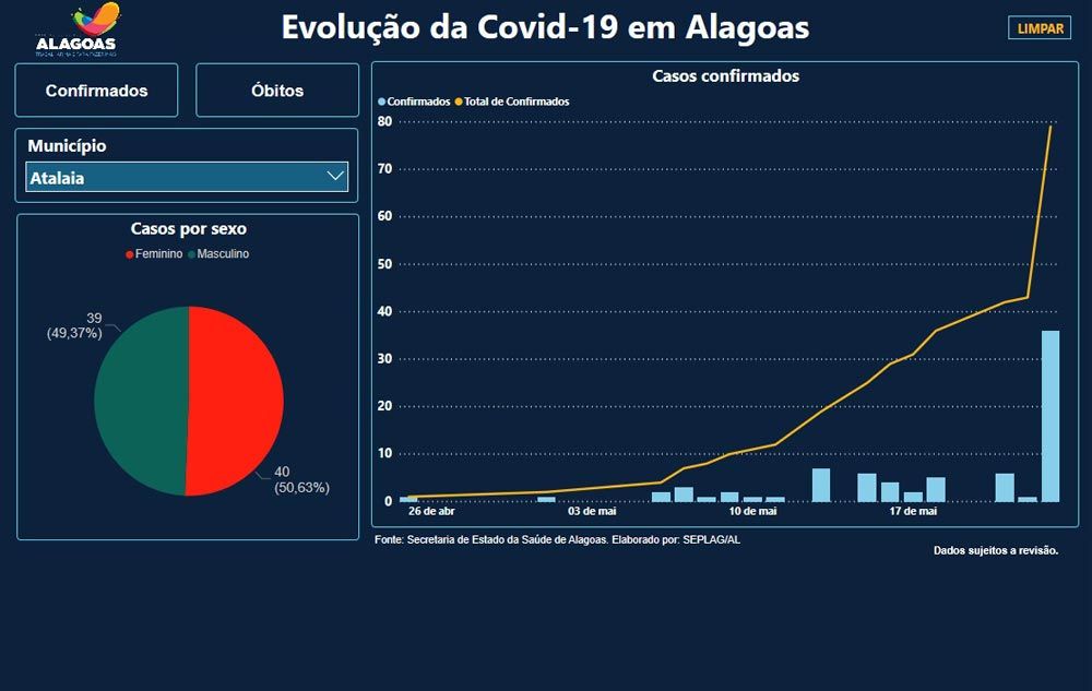 O Painel Covid-19 em Alagoas, da Secretaria de Estado da Saúde, atualizou no final da noite deste último domingo (24), o perfil dos casos confirmados e de óbitos relacionados a covid-19 no município de Atalaia. O número de casos confirmados saltou para 79, sendo 2 óbitos.
