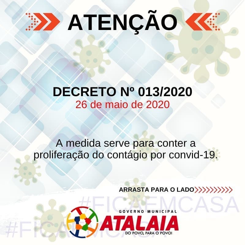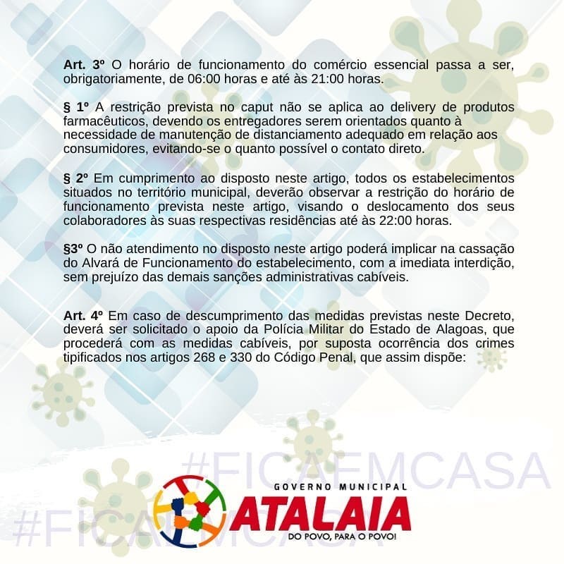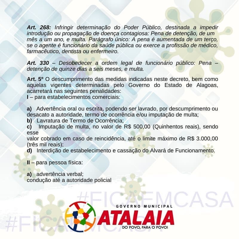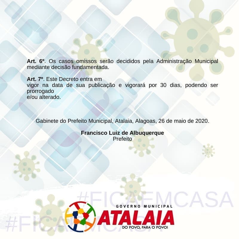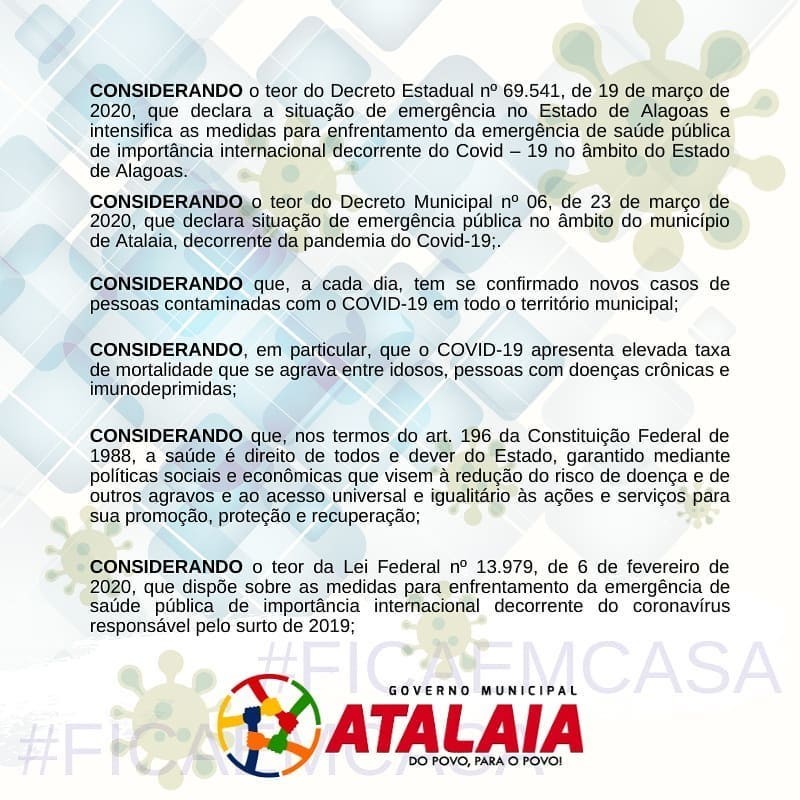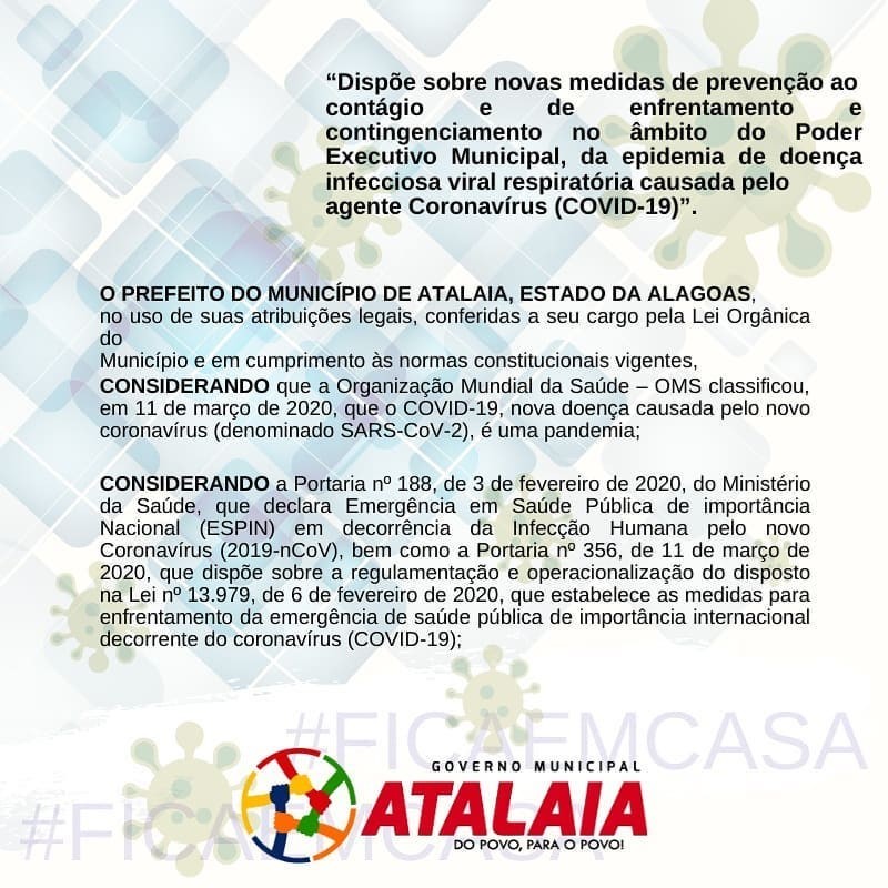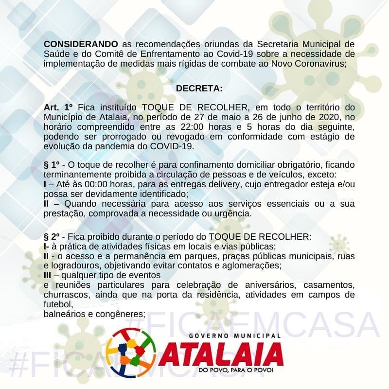 O Prefeito Chico Vigário endureceu as medidas de enfrentamento ao novo coronavírus e decretou toque de recolher em todo território do município de Atalaia. A determinação vale para o período de 27 de Maio a 26 de Junho de 2020, das 22h às 05h do dia seguinte, podendo ser prorrogado ou revogado em conformidade com estágio de evolução da pandemia da Covid-19. E os moradores estarão obrigados ao confinamento domiciliar.