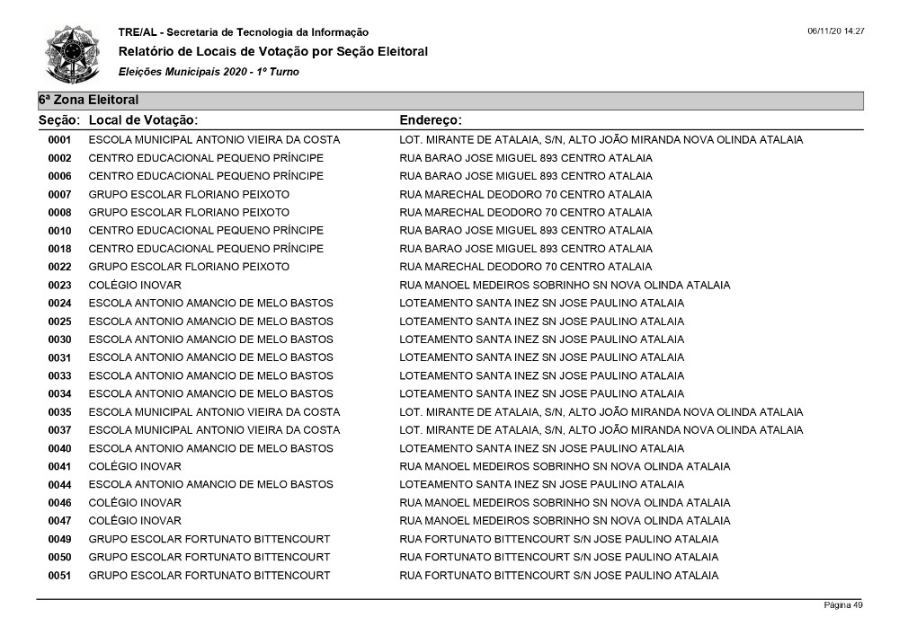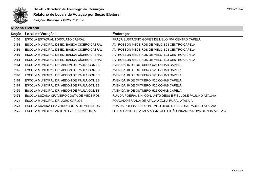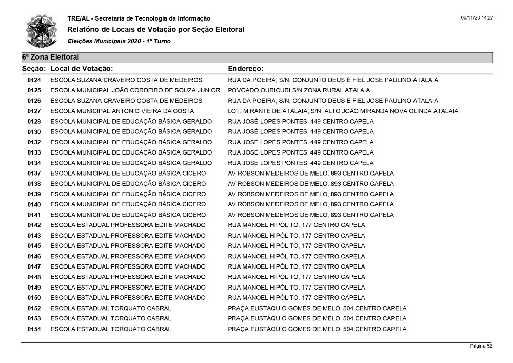 O Tribunal Regional Eleitoral - TRE de Alagoas divulgou em seu portal os locais de votação/seções eleitorais de todos os municípios alagoanos.