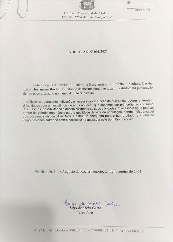 A Indicação da vereadora Lays Melo (PSC) de nº 001/2021, em que solicita ao Poder Executivo que faça um estudo para a perfuração de um poço artesiano no bairro São Sebastião, em Atalaia, foi apresentada na Sessão Ordinária realizada nesta última terça-feira, dia 23 de fevereiro.