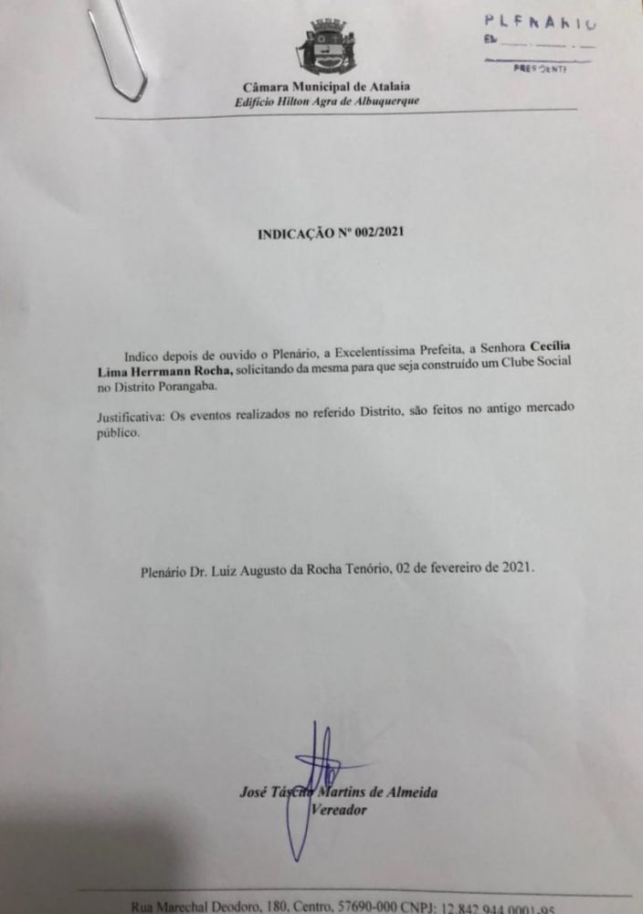 Já na indicação de número 002/2021, solicita do chefe do Executivo, a construção de um Clube Social. “Os eventos realizado no Distrito Poranfaga são feitos no antigo Mercado Público. Aquele pessoal não tem um local para a comunidade se reunir e fazer qualquer tipo de comemoração ou de reunião. Então, peço a prefeita que estude, não num curto tempo, mas num longo tempo, para fazer esse Clube Social no Distrito Porangaba”, destacou o vereador na Tribuna da Câmara.