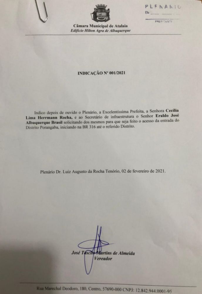 Preocupado com uma das localidades mais distantes do centro de Atalaia, o vereador José Tascito Martins de Almeida, o Tacinho (PP), apresentou durante a Sessão Ordinária desta última terça-feira (02), duas importantes indicações para o Distrito Porangaba.