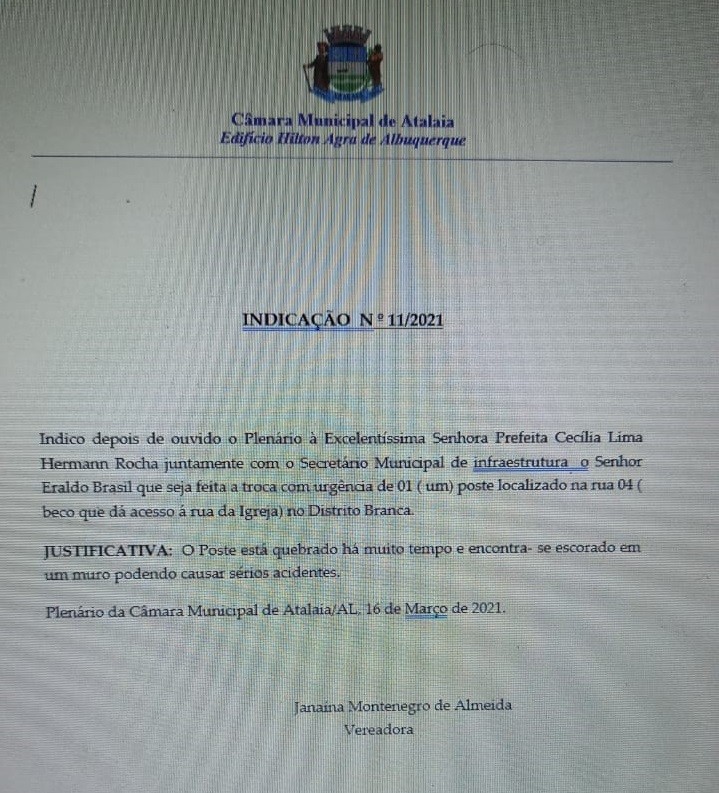 Já na Indicação de número 11/2021, a vereadora pede urgência à Prefeitura de Atalaia, através da Secretaria de Infraestrutura, para que seja feita a troca de um poste localizado na Rua 04 (beco que dá acesso a Rua da Igreja), no Distrito Branca.