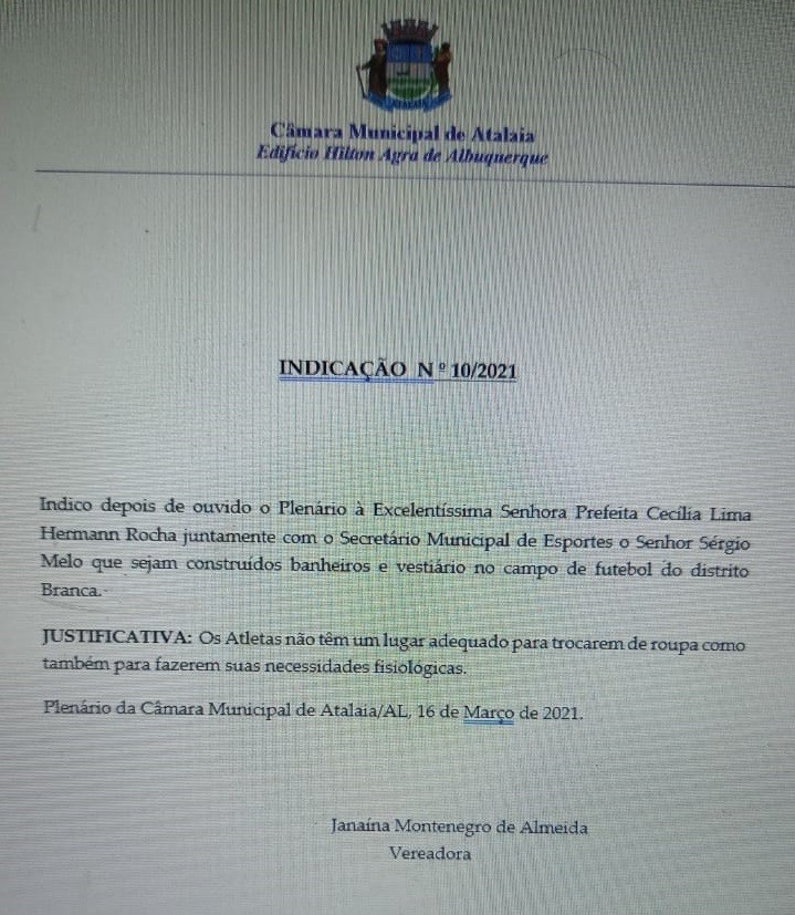 Em sua Indicação de número 10/2021, a vereadora Janaína solicita da prefeita Ceci Rocha e do secretário de esportes Sergio Melo, que sejam construídos banheiros e vestiários no campo de futebol do Distrito Branca. “Os atletas não têm lugar adequado para trocarem de roupa, como também para fazerem suas necessidades fisiológicas”, destacou.