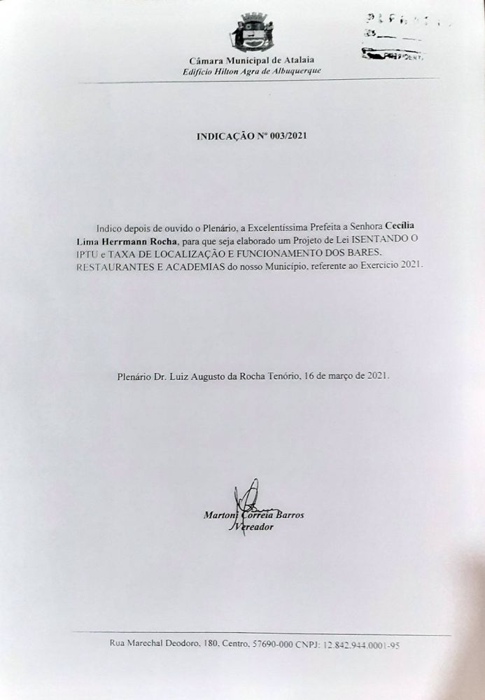 Foi aprovada na Sessão Ordinária desta terça-feira (16), na Câmara Municipal de Atalaia, a Indicação 003/2021, apresentada pelo vereador Toni Barros, solicitando que o Poder Executivo elabore um Projeto de Lei isentando do IPTU (Imposto Predial e Territorial Urbano) e das taxas de localização e funcionamento, os bares, restaurantes e academias do nosso município, durante todo o ano de 2021.