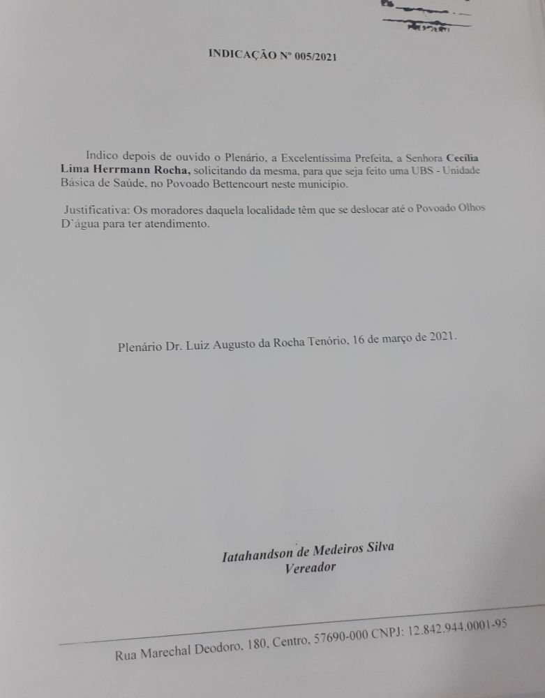 O vereador Anderson Medeiros (PSC) teve aprovado na sessão ordinária desta terça-feira (16), na Câmara Municipal de Atalaia, a Indicação 005/2021 de sua autoria, solicitando ao Poder Executivo a construção de uma Unidade Básica de Saúde (UBS) no Povoado Bittencourt, para atender os moradores daquela localidade.