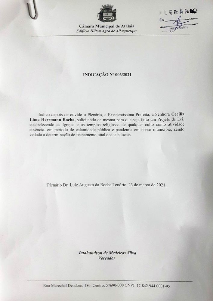 O vereador Anderson Medeiros (PSC) defendeu a elaboração de um Projeto de Lei por parte do Executivo, que torne as Igrejas e demais templos religiosos de qualquer culto, como atividade essencial no município de Atalaia, em período de calamidade pública e pandemia.