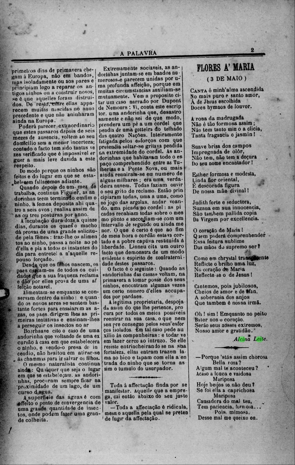 “Quem conhece a exma. Professora D. Alcina Leite sabe que ela, por um esforço quase superior a sua vontade, exerce o magistério. Por muitas vezes, tendo ocasião de ser colocada em centros populosos, sempre recusou, não obstante ser uma das mais adiantadas pelo seu talento bastante cultivado, em conseqüência de não suportar sua saúde, trabalho forçado. São tão repetidos os ataques de asmas que sofre essa senhora e tais alterações lhe tem este terrível incomodo ocasionado no organismo, que a primeira vista se conhece não gozar ela saúde”, destacava publicação do jornal Pátria, de 20 de dezembro de 1892.