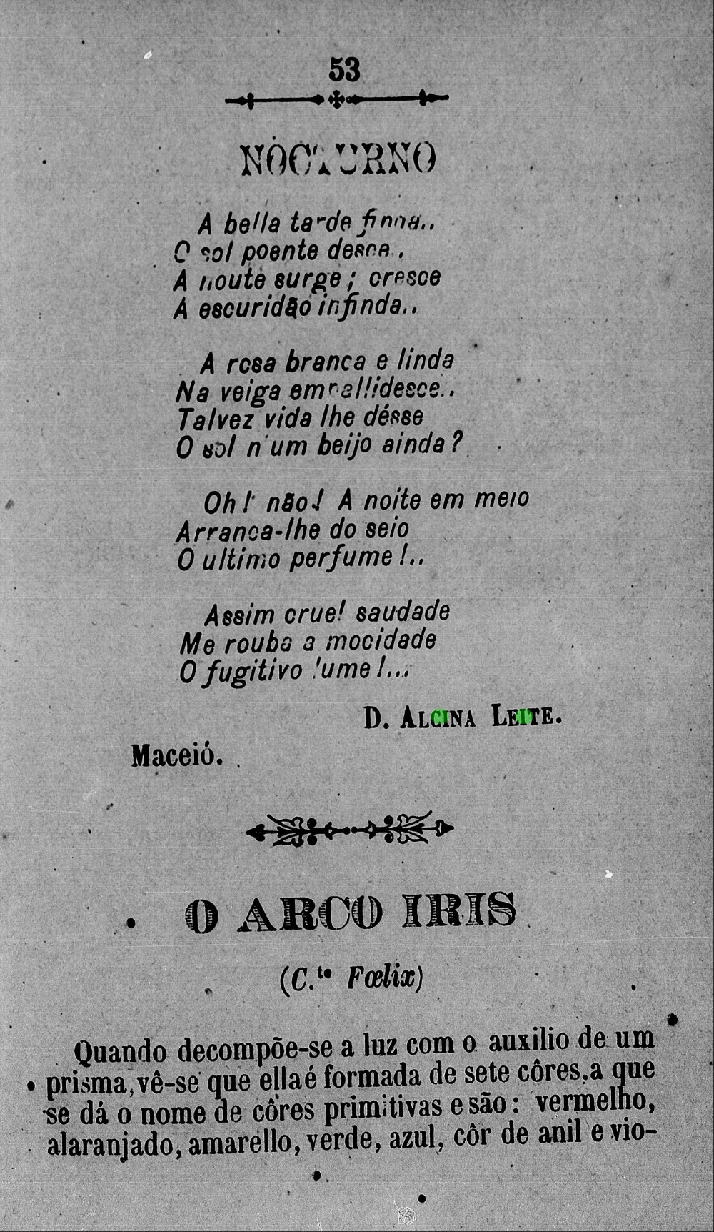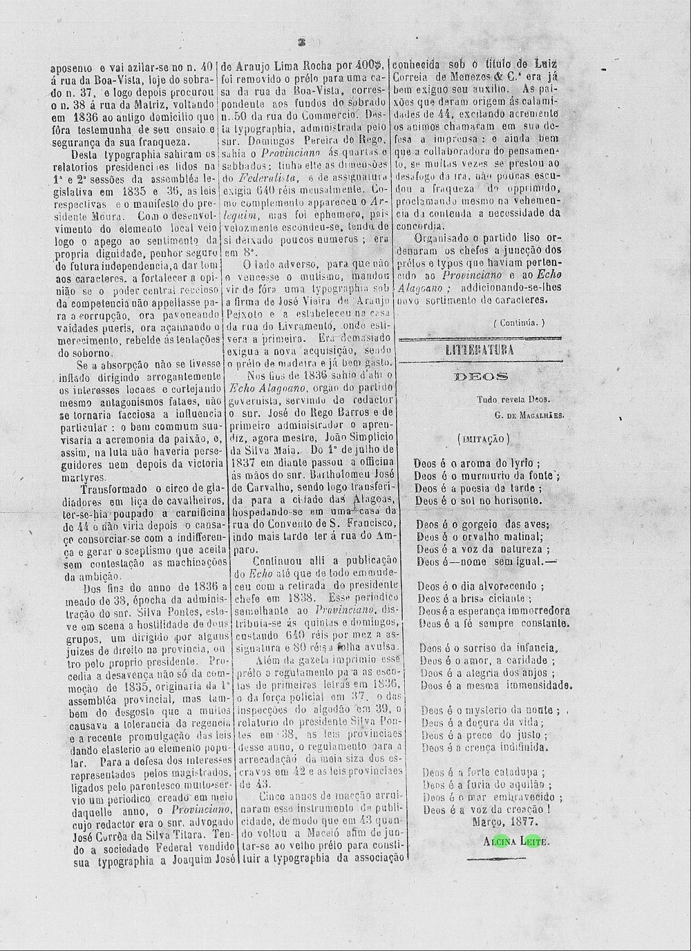 “Alcina Leite, meretissima professora publica de Coqueiro Seco. Tão modesta quão talentosa, a nossa jovem patrícia não vem estrear nas humildes columnas do Gutemberg; em outros jornaes desta capital, e nas paginas do Almanak Luzo-Brasileiro, sob o pseudônimo – Sensictiva – já tem a exma. d. Alcina Leite se revelado poetisa inspirada e culta distincta das letras. Saudamos enthusiasticos a illustrada preceptora alagoana, pedimos-lhe digne-se honrar-nos sempre com as mimosas produções de sua intelligencia brilhante”, (Gutenberg, 20 fev. 1881).
