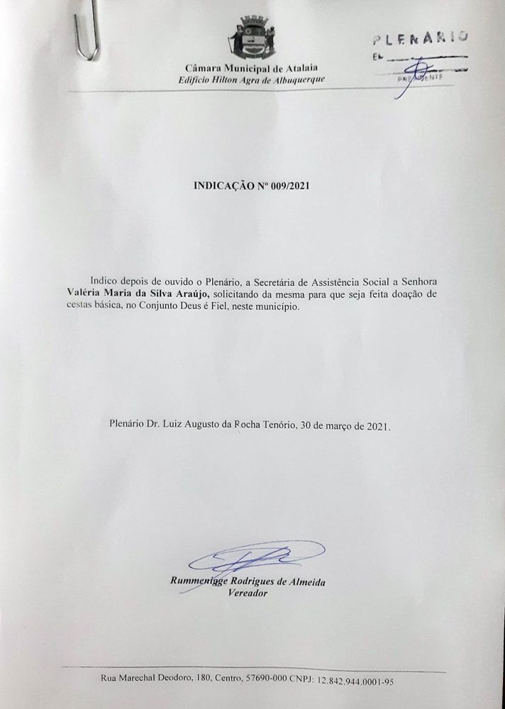Durante a sessão ordinária desta última terça-feira (30), o vereador Rudinho (PSC) solicitou da Secretaria Municipal de Assistência Social, que seja fornecida cestas básicas para as famílias residentes no Conjunto Deus É Fiel, uma das localidades mais carentes do município de Atalaia.