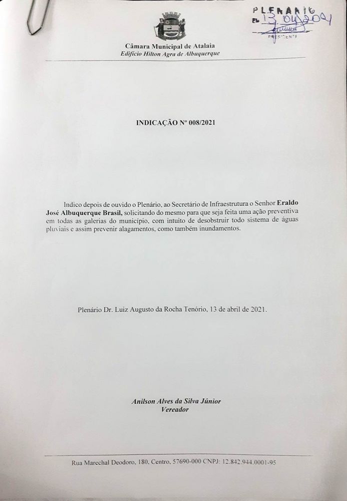 O vereador Anilson Júnior encaminhou à Prefeitura de Atalaia, com cópia para a Secretaria de Infraestrutura, indicação solicitando a completa limpeza e manutenção em todas as galerias pluviais do município.