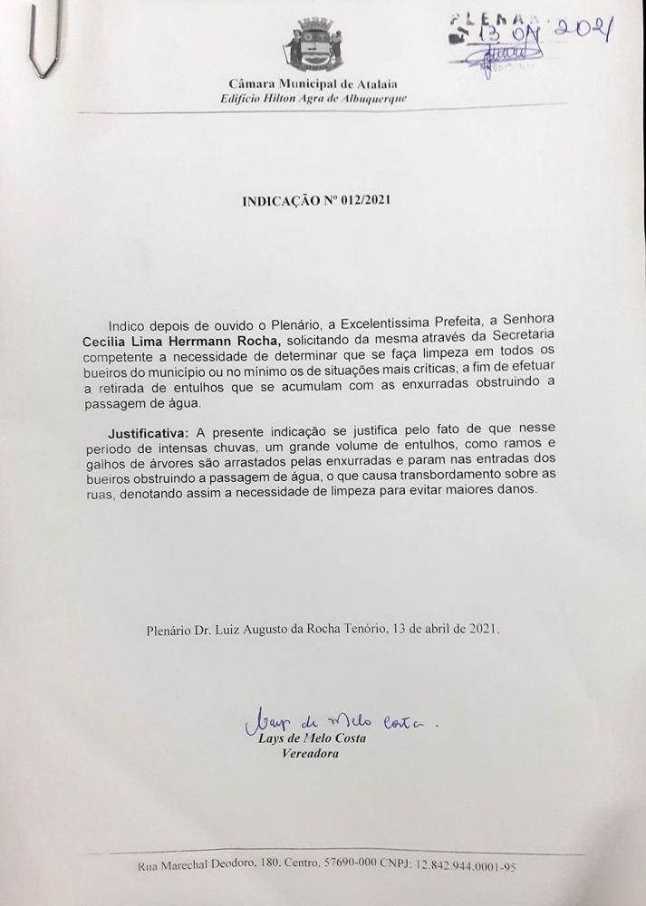 Durante a sessão ordinária desta última terça-feira (13), a vereadora atalaiense Lays Melo também apresentou suas Indicações 012 e 014/2021, visando, respectivamente, a limpeza e desobstrução de todos os bueiros do município e a vacinação contra a covid-19 para os estagiários de enfermagem.