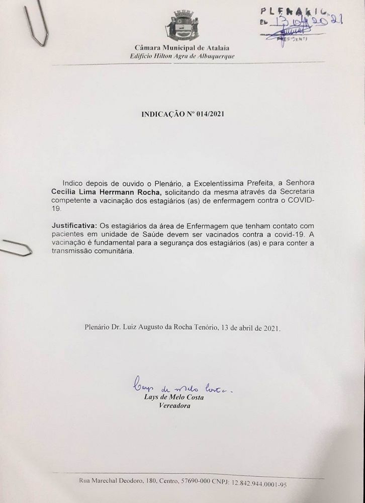 Já em sua indicação de número 014/2021, a vereadora Lays Melo pede a prefeita Cecília Rocha, através da Secretaria competente, que os estagiários de enfermagem do município, sejam vacinados contra a covid-19.