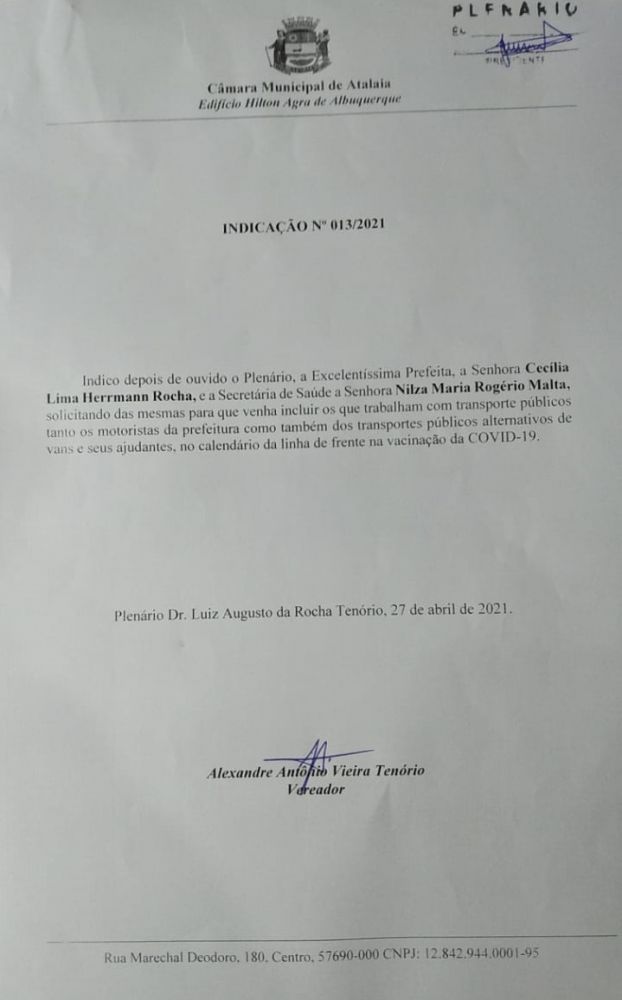 O vereador Alexandre Tenório (MDB) solicitou a Prefeitura Municipal de Atalaia, por meio da Indicação nº 013 de 27 de abril de 2021, a inclusão dos que trabalham com transporte público no município, no calendário das categorias prioritárias do plano de vacinação contra Covid-19.