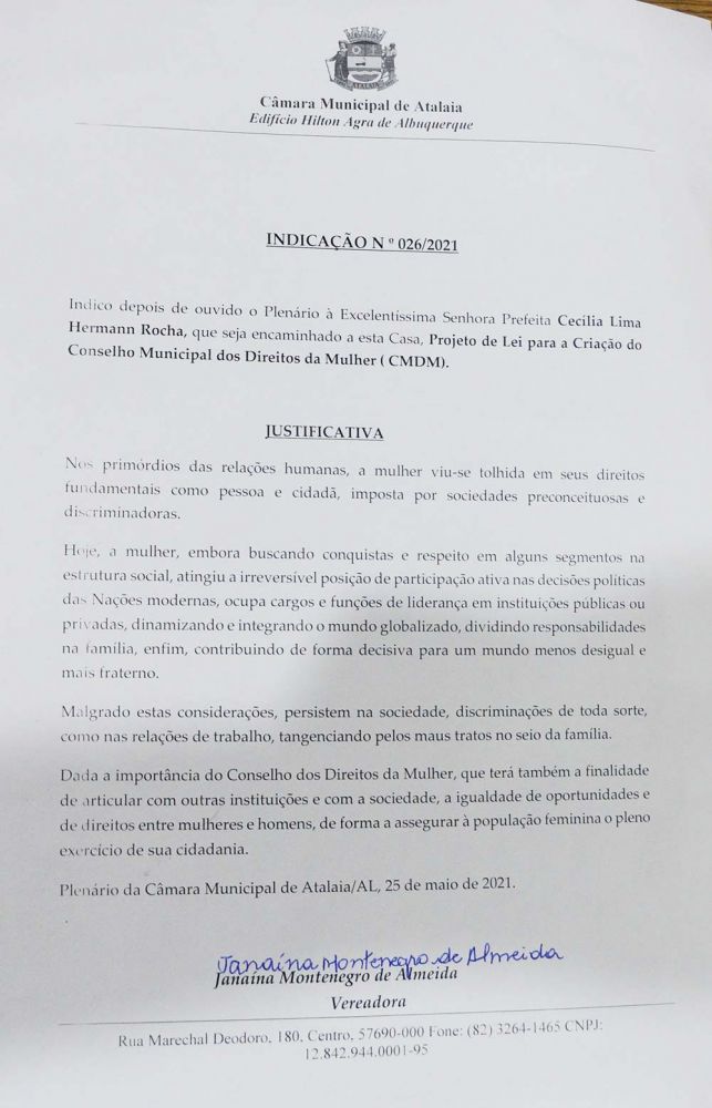A Câmara Municipal de Atalaia aprovou de forma unânime na sessão ordinária desta terça-feira (25), a Indicação 026/2021, de autoria da vereadora Janaína do Cal (MDB) e subscrita pela vereadora Lays Melo (PSC), que solicita ao Poder Executivo o envio de um Projeto de Lei para a criação do CONSELHO MUNICIPAL DOS DIREITOS DA MULHER (CMDM).