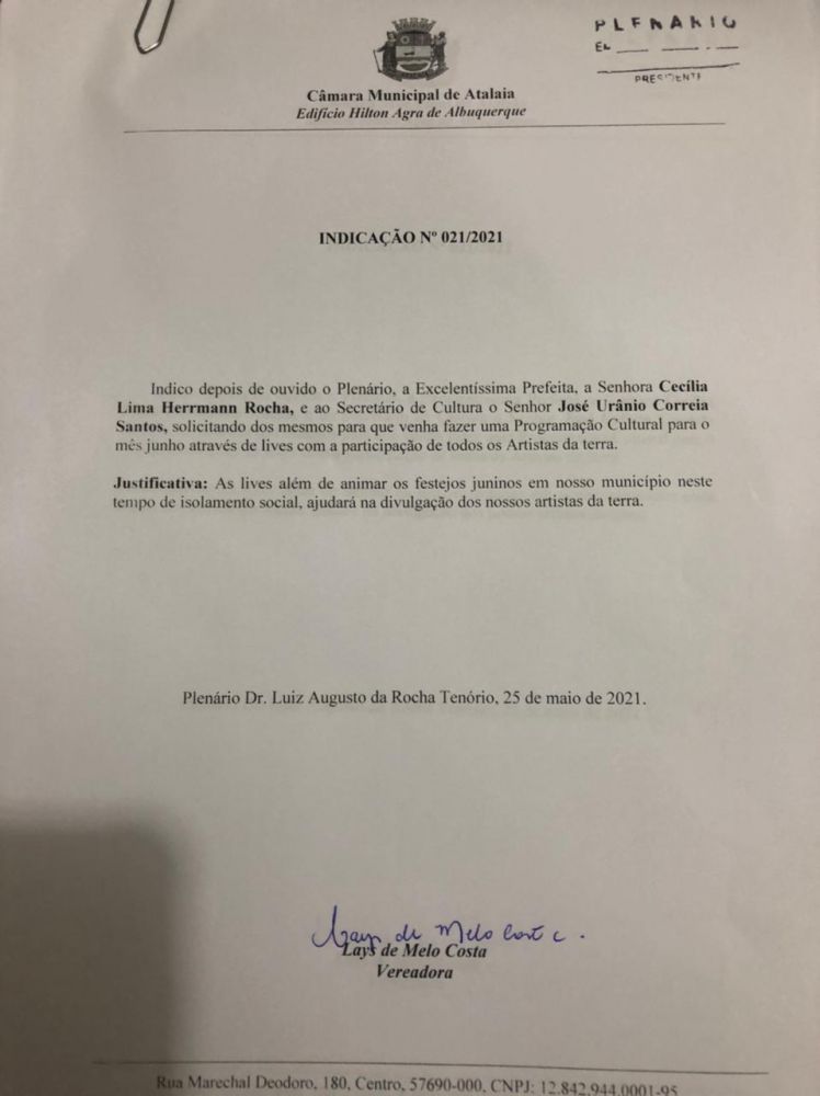 Em todo Brasil, a classe artística é uma das mais impactadas com a adoção das necessárias medidas de distanciamento social para evitar o avanço da covid-19. Em Atalaia, para amenizar um pouco esse impacto e buscar valorizar a cultura atalaiense, a vereadora Lays Melo apresentou na sessão ordinária desta terça-feira (25), sua Indicação de número 021/2021.