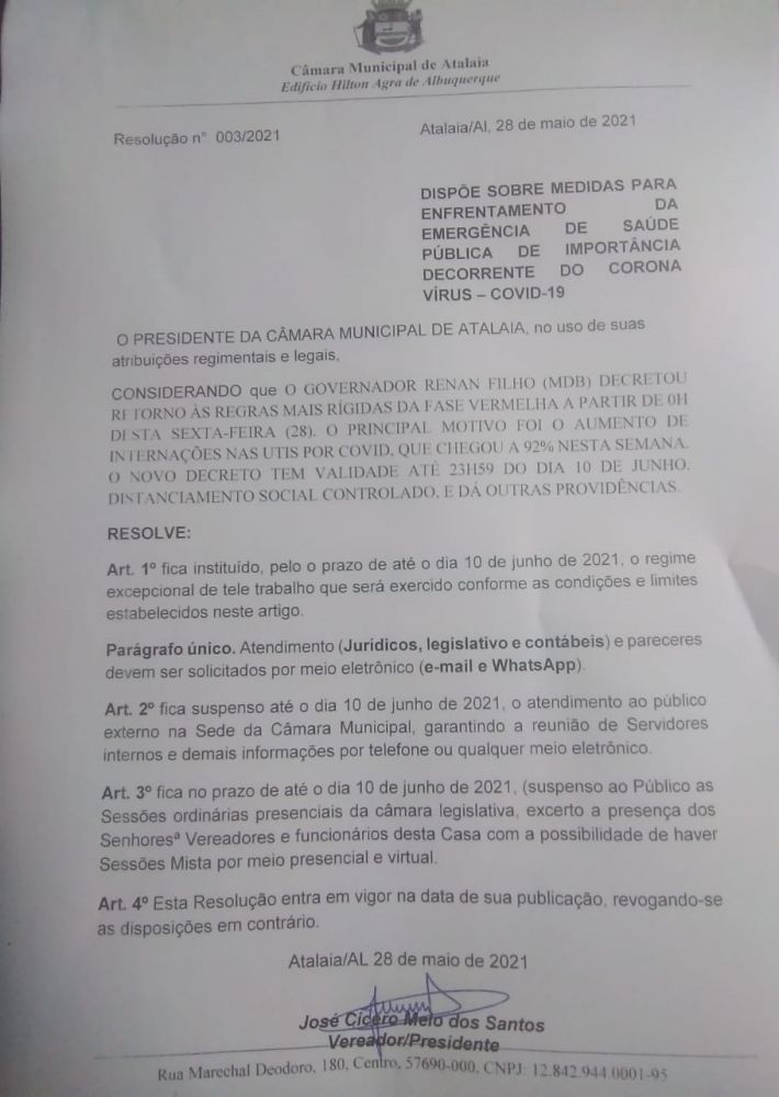 Com o reagravamento da pandemia de Covid-19, a Câmara Municipal de Atalaia, através de seu presidente, vereador Cicinho Melo (PSC), voltou a adotar medidas mais restritivas para ajudar a frear a circulação do vírus. As medidas estão presentes na Resolução 003/2021.