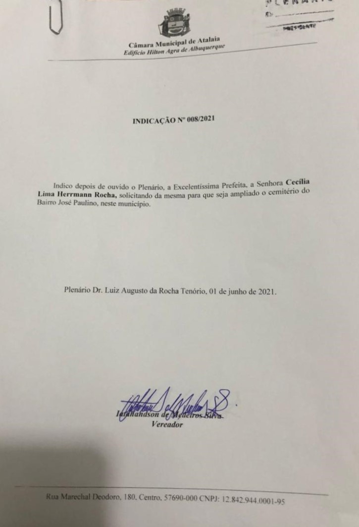Durante a sessão Anderson Medeiros também apresentou sua Indicação de número 08/2021, endereçada a prefeita Cecília Rocha, solicitando que seja ampliado o cemitério do bairro José Paulino.