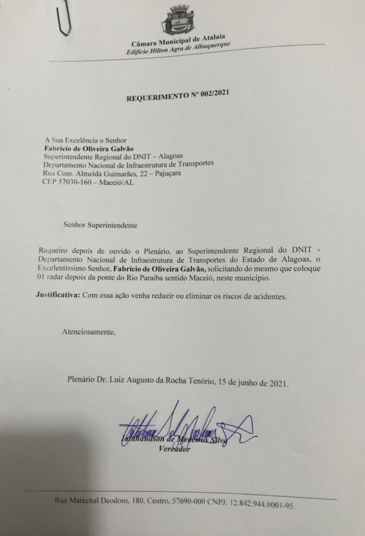 O vereador Anderson Medeiros (PSC) apresentou na sessão ordinária desta terça-feira (15), o Requerimento 02/2021, no qual solicita ao DNIT Alagoas, a colocação de um radar eletrônico logo após a ponte sobre o Rio Paraíba, na BR-316, em Atalaia, sentido Maceió.
