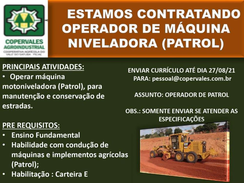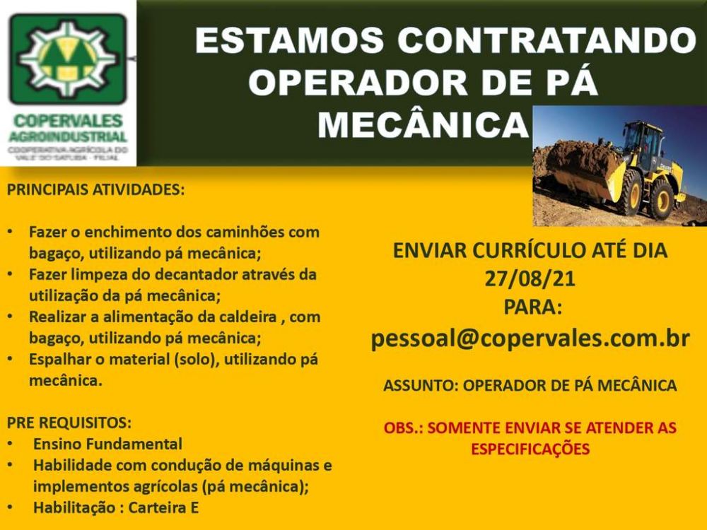 A Cooperativa Agrícola do Vale do Satuba (Coopervales Agroindustrial) está selecionando colaboradores para trabalhar como operador de pá mecânica e operador de máquina niveladora (patrol).