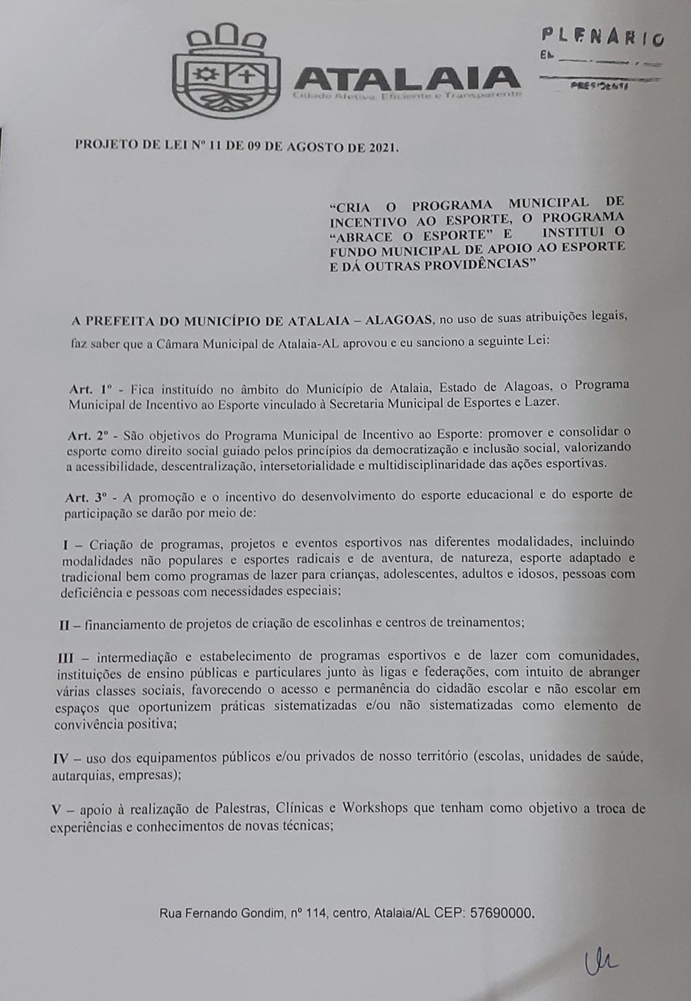 Foi lido na sessão ordinária desta terça-feira (17), o Projeto de Lei nº 11/2021, oriundo do Poder Executivo, que cria o Programa “ABRACE O ESPORTE”, que tem o objetivo de fortalecer e incentivar a prática esportiva no município de Atalaia, instituindo também um fundo de apoio ao esporte.