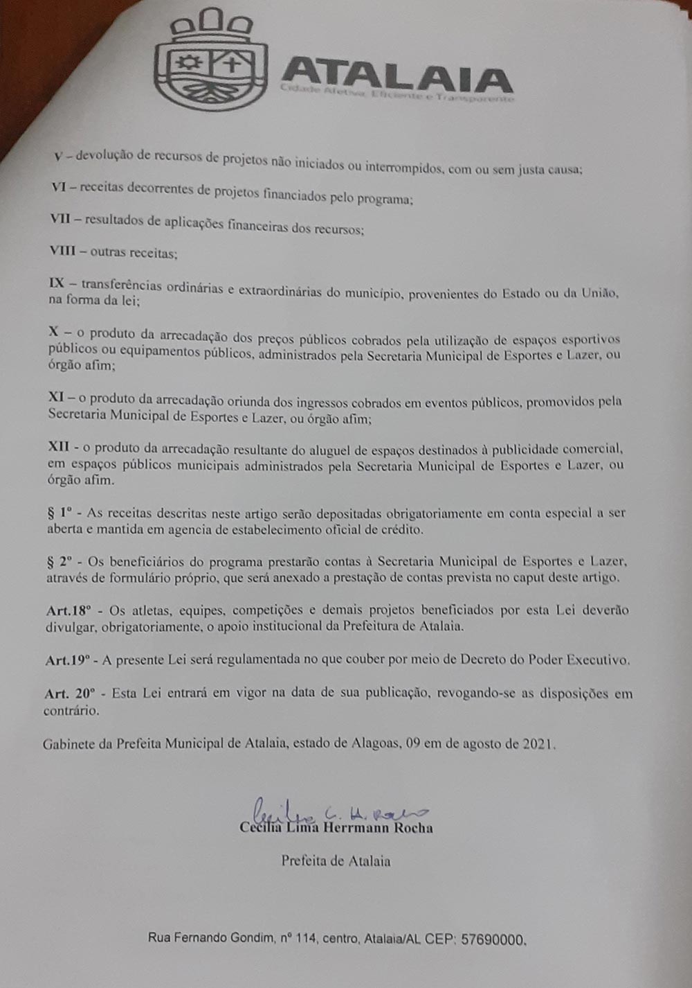 “Como forma de melhorar a formação de nossos jovens, que com certeza estarão ocupando melhor o seu tempo ocioso, além de contribuir com uma melhor qualidade de vida para jovens, adultos e idosos, valorizando a saúde e os tantos talentos existentes no município”, destaca a prefeita Ceci Rocha (PSC), em mensagem que acompanhou o Projeto de Lei.