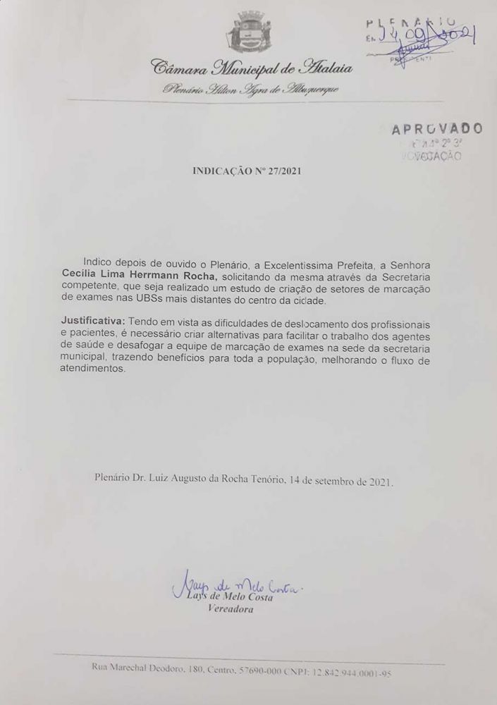 O Plenário da Câmara Municipal de Atalaia aprovou na sessão ordinária desta terça-feira (14), a Indicação de nº 27/2021 de autoria da vereadora Lays Melo (PSC), que solicita que o Poder Executivo realize um estudo para criação de setores de marcação de exames nas Unidade Básicas de Saúde que estão localizadas distantes do centro de Atalaia.