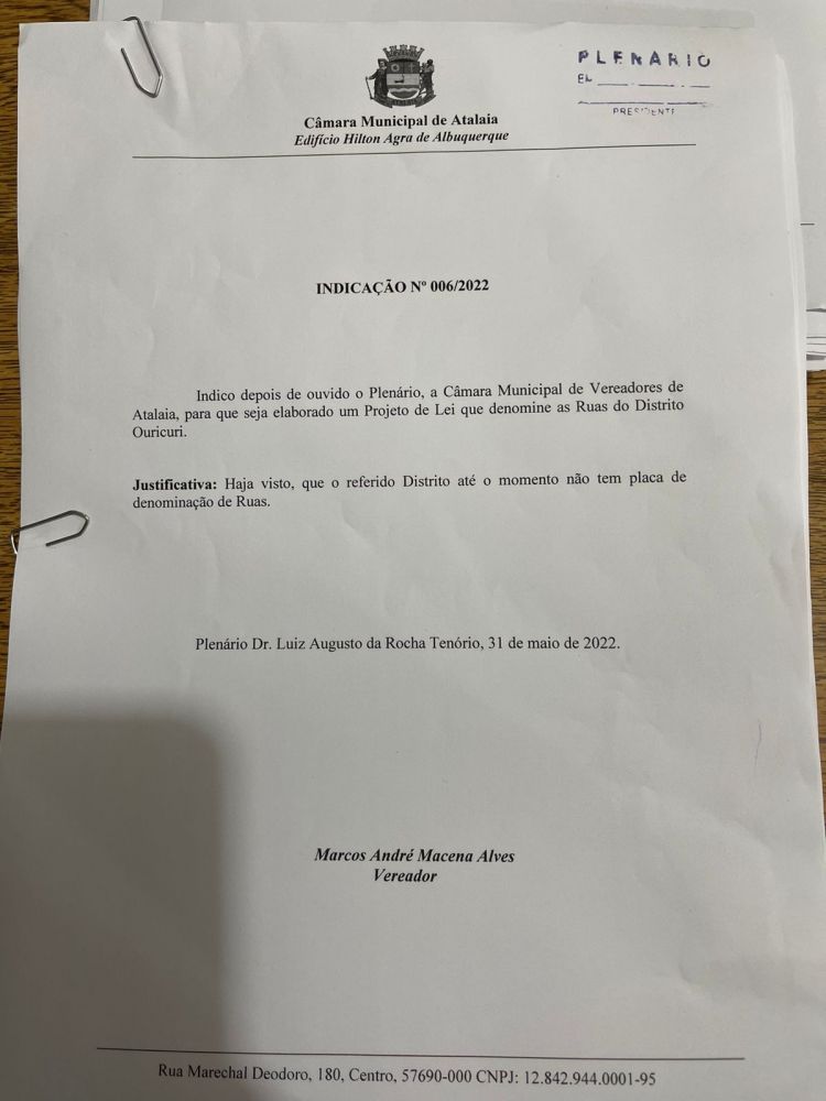 A Câmara de Atalaia aprovou por unanimidade na sessão ordinária desta última terça-feira (14), a Indicação 006/2022 do vereador Marcos Rebollo (MDB) que visa a elaboração de um Projeto de Lei que denomine as ruas do Distrito Ouricuri.