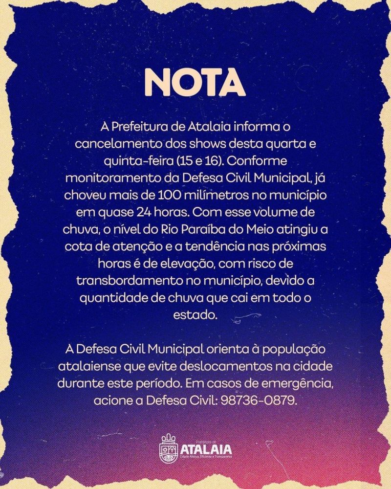A Prefeitura de Atalaia, Região Metropolitana de Maceió, anunciou, na noite desta quarta-feira (15), por meio de nota, o cancelamento da programação junina anunciada para o município, na noite de hoje e desta quinta-feira (16).