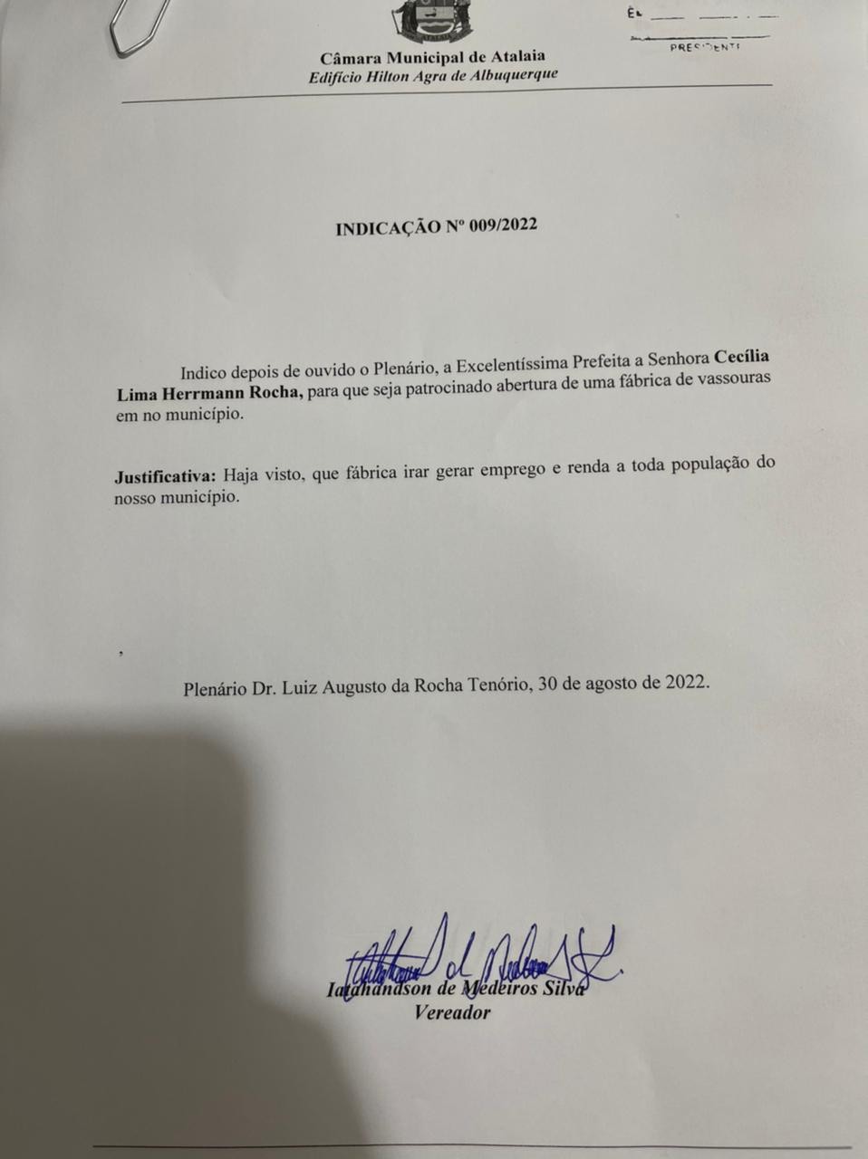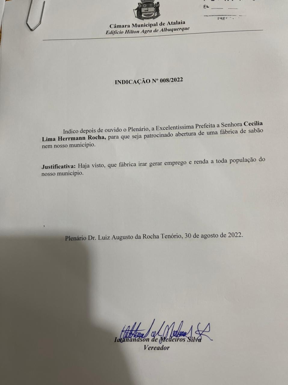 Em suas solicitações, o vereador pede que a Prefeitura de Atalaia busque meios para incentivar a instalação de uma fábrica de Sabão e de uma fábrica de Vassouras.