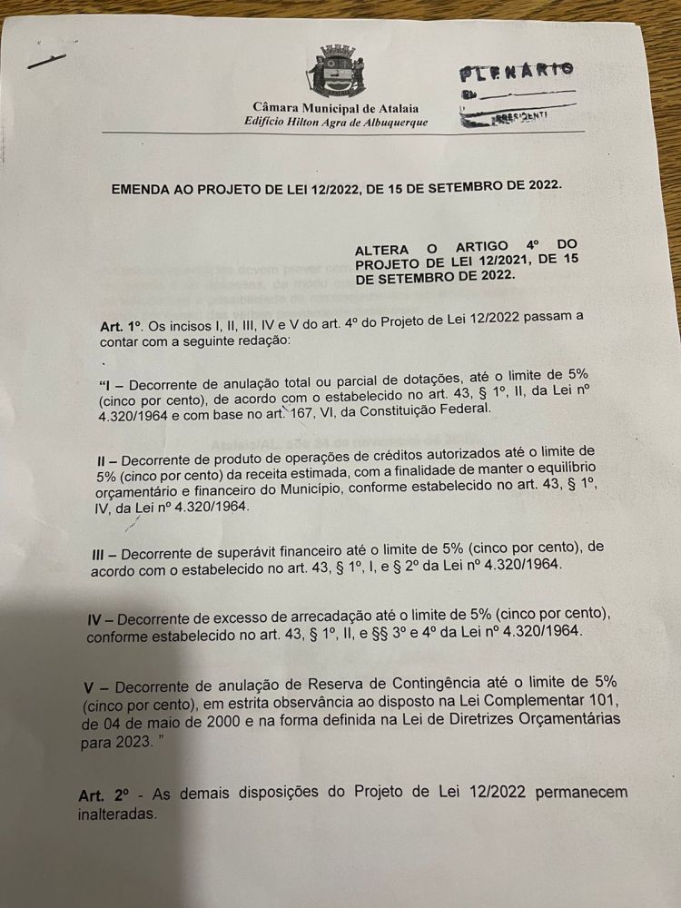 O Vereador Anderson Medeiros (PSC) propôs uma Emenda ao Projeto de Lei de Diretrizes Orçamentárias (LDO), para o exercício de 2023 em Atalaia. A Emenda foi apresentada na Sessão Ordinária desta terça-feira, 29 de novembro e agora segue para análise das Comissões da Casa.