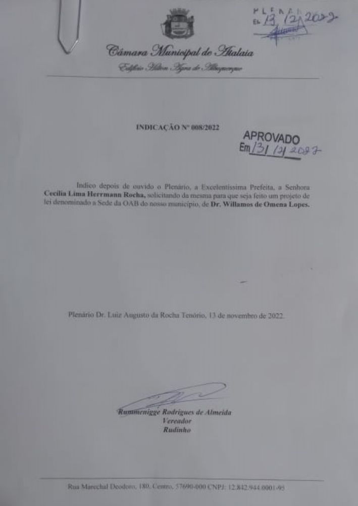 A proposta, presente na Indicação 008/2022, solicita ao Poder Executivo a elaboração de um Projeto de Lei denominando de Dr. Wilamo de Omena Lopes o prédio da Subseção da Ordem dos Advogados do Brasil, que em breve será construído em Atalaia.