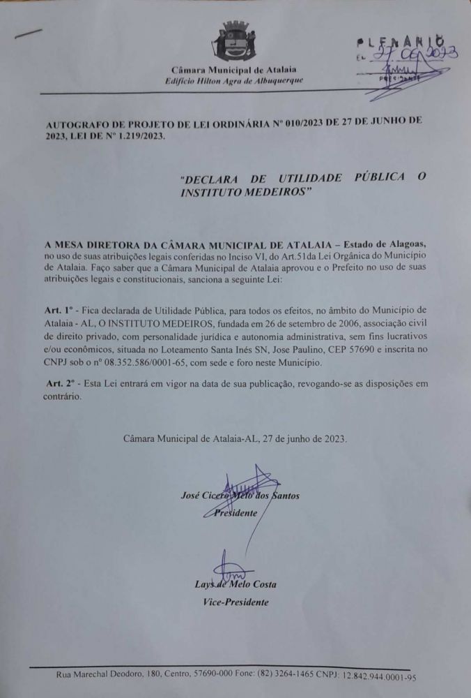 Em reconhecimento ao importante trabalho social que será desenvolvido em Atalaia, a Câmara Municipal aprovou na sessão ordinária desta terça-feira, 27 de junho, o projeto de lei ordinária (10/2023) que declara de utilidade pública o INSTITUTO MEDEIROS.