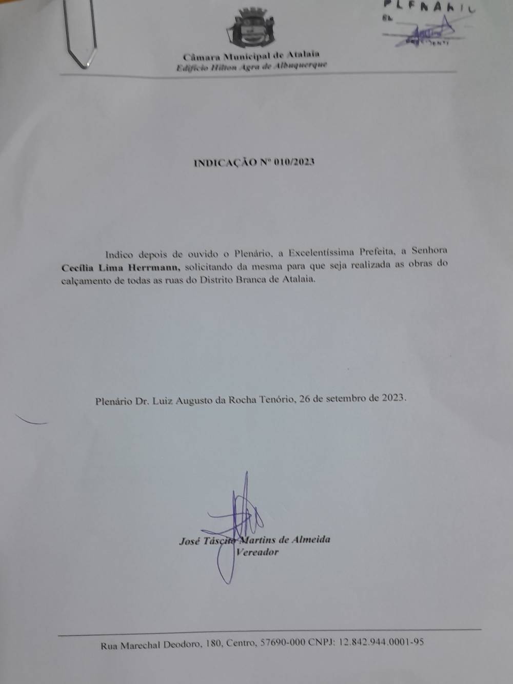 Já em sua Indicação 10/2023, também solicita da chefe do executivo atalaiense que realize obras de calçamentos em todas as ruas dos Distritos, uma das demandas mais solicitadas pelos moradores daquela região.