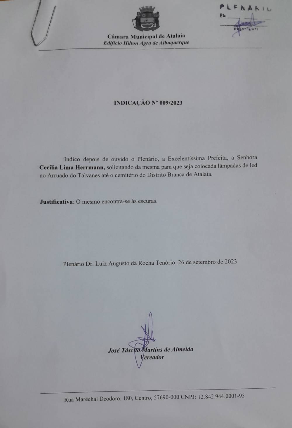 Na Indicação 09/2023, solicitou da prefeita Ceci que seja colocadas lâmpadas led do Arruado conhecido como do Talvanes, até o cemitério daquele Distrito.