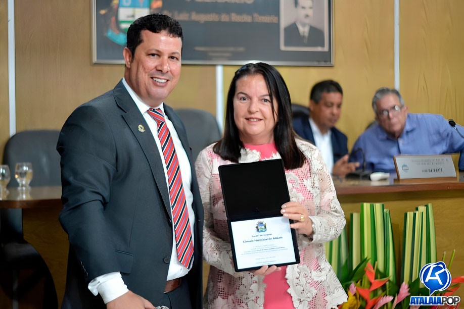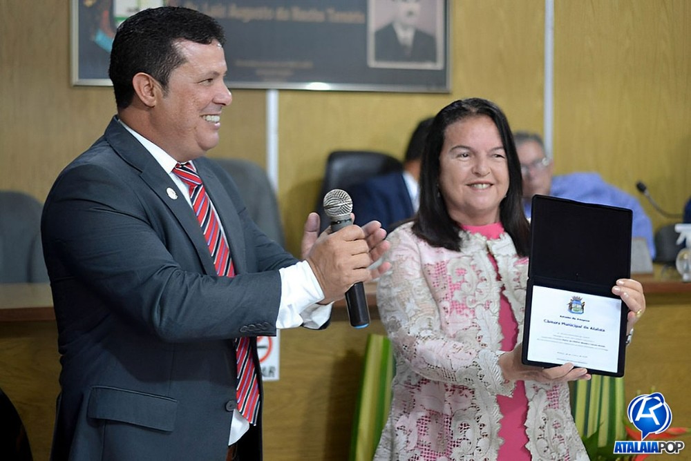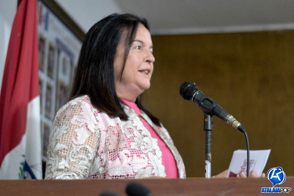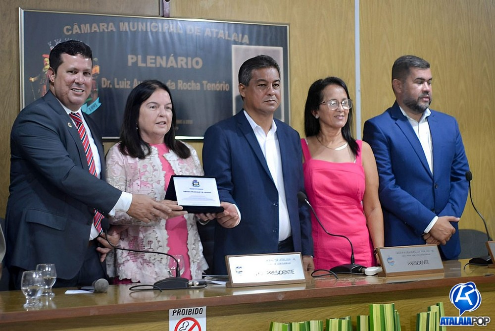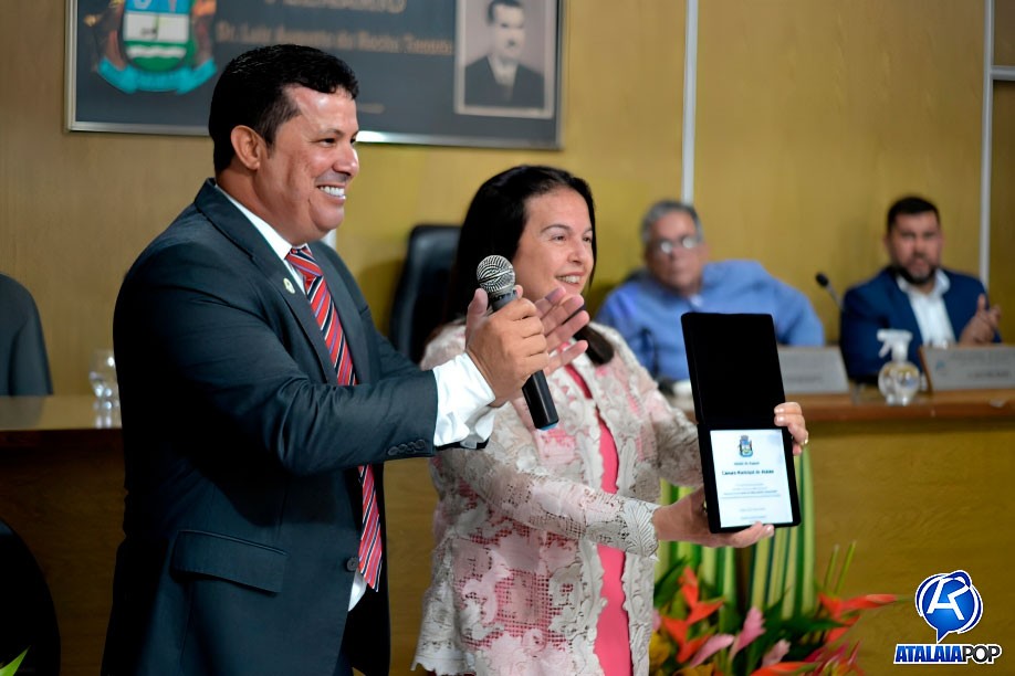 Em sessão solene realizada na manhã desta quinta-feira (28), a Câmara Municipal de Atalaia realizou a entrega do Título de Cidadã Honorária de Atalaia à deputada estadual Fátima Canuto, pelos relevantes serviços prestados à comunidade atalaiense ao longo dos últimos anos. A honraria foi proposta pelo vereador Anderson Medeiros (PSSB), sendo aprovada por unanimidade.