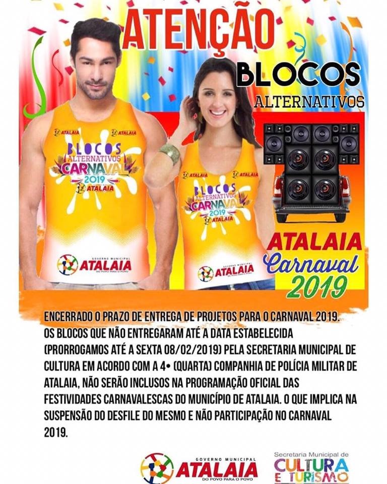 Em nota divulgada na manhã deste sábado (09), a Prefeitura Municipal de Atalaia, através de sua Secretaria de Cultura, comunicou o encerramento do prazo para os Blocos Alternativos do município realizarem a entrega dos projetos para o Carnaval 2019. A data tinha sido prorrogada para até esta última sexta-feira (08).