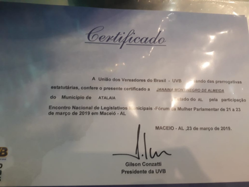 A vereadora do município de Atalaia, Janaína do Cal, participou nos dias 21, 22 e 23 de março, do Encontro Nacional dos Legislativos Municipais e Fórum da Mulher Parlamentar, realizados no auditório da OAB/AL, em Maceió.