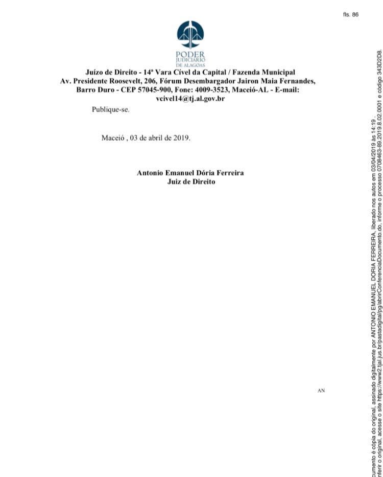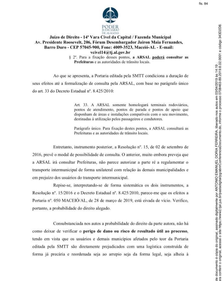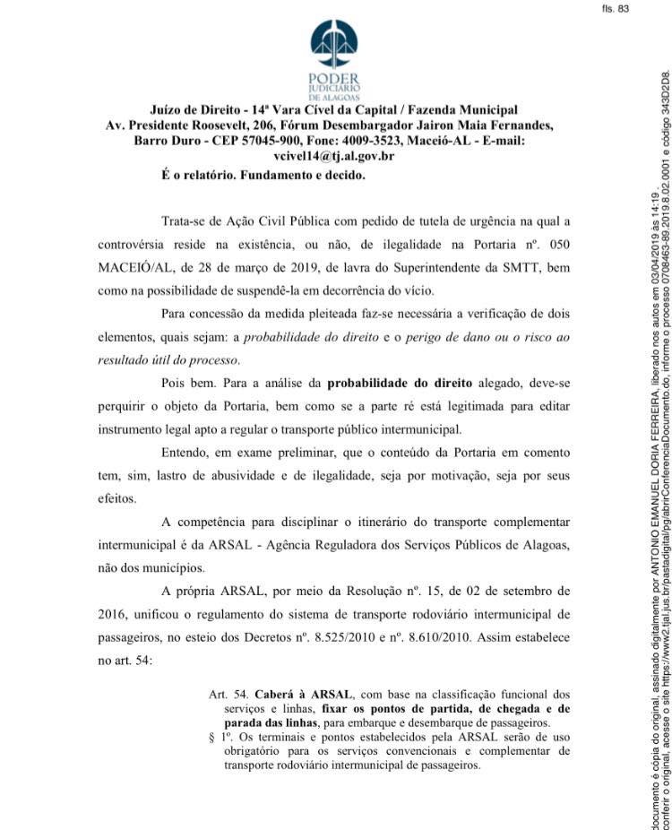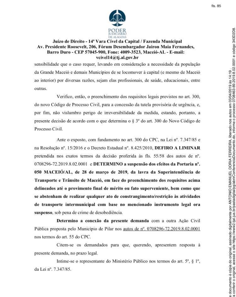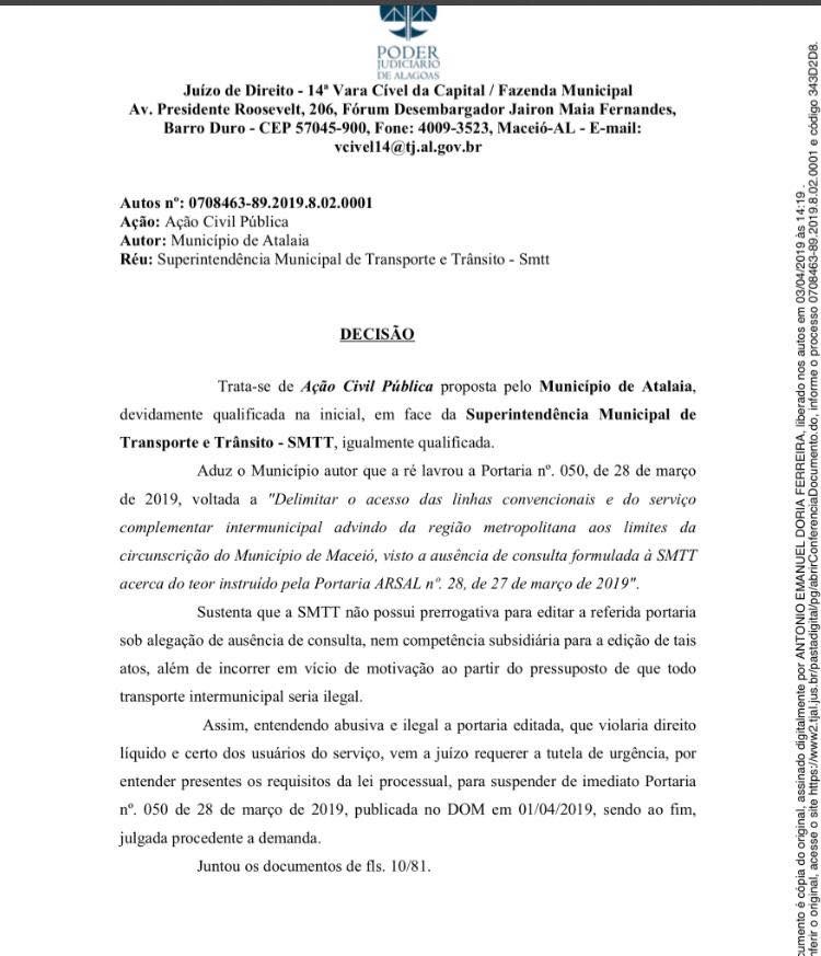 Foi concedida nesta quarta-feira (03), a decisão liminar requerida pelo município de Atalaia na pessoa do prefeito Chico Vigário, por meio da Ação Civil Pública Nº 0708463-89.2019.8.02.0001, que determina a suspensão dos efeitos da Portaria 050/2019, oriunda da Superintendência Municipal de Transporte e Trânsito – SMTT de Maceió, que altera os pontos de embarque e desembarque de passageiros dentro da cidade de Maceió.