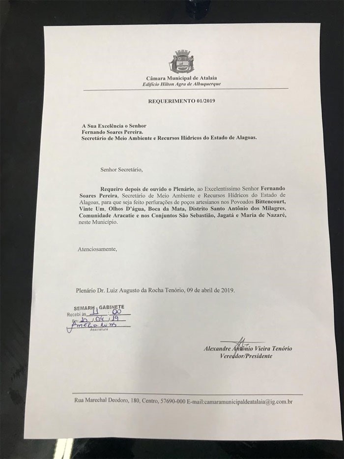 Na oportunidade, o vereador Alexandre Tenório pôde entregar uma cópia do Requerimento 01/2019, de sua autoria e aprovado pelos demais vereadores, solicitando melhorias no abastecimento de água em várias regiões de Atalaia. O requerimento solicita a perfuração de poços artesianos no Povoado Bittencourt, Povoado Olhos D’água, Povoado Boca da Mata, Bairro 21, Comunidade Aracatie e nos Conjuntos São Sebastião, Jagatá e Maria de Nazaré.