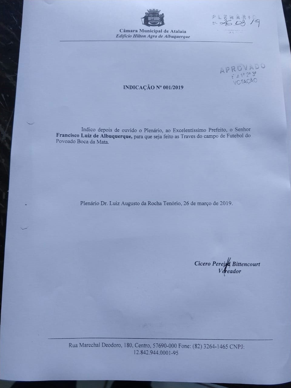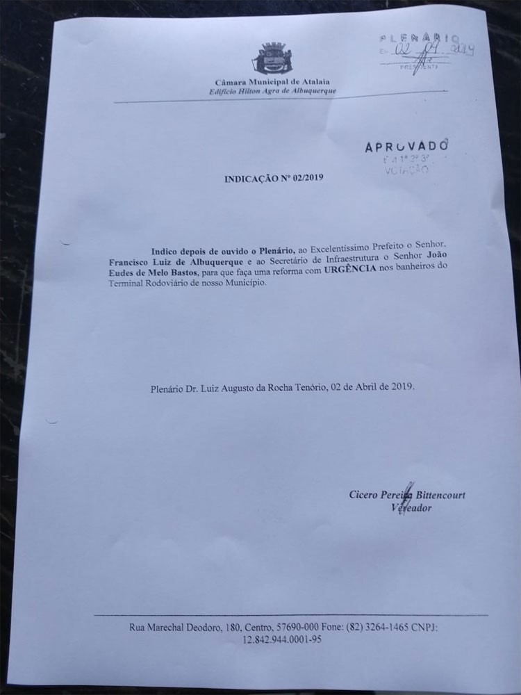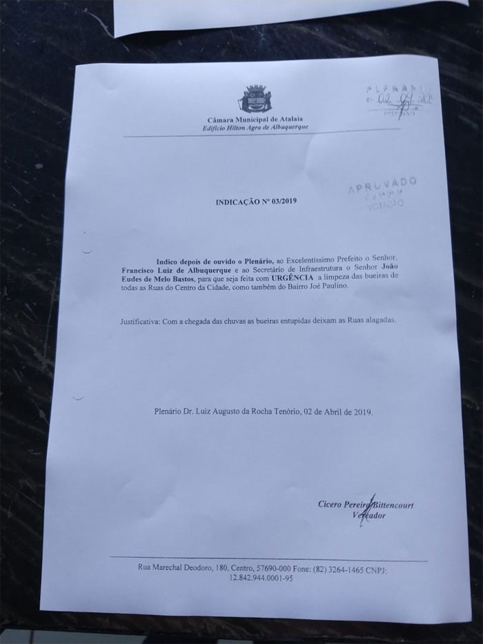 Na oportunidade, o vereador Quinho também solicitou do Poder Executivo, melhorias nas áreas de infraestrutura e esporte. A de número 01/2019, solicitou que sejam feitas as traves do campo de futebol do Povoado Boca da Mata. A de número 02/2019, solicitou com urgência, a reforma nos banheiros do Terminal Rodoviário. Já na Indicação de número 03/2019, também pediu urgência ao Poder Executivo para a limpeza das bueiras de todas as ruas do centro da cidade e do bairro José Paulino, tendo em vista a proximidade do período chuvoso.