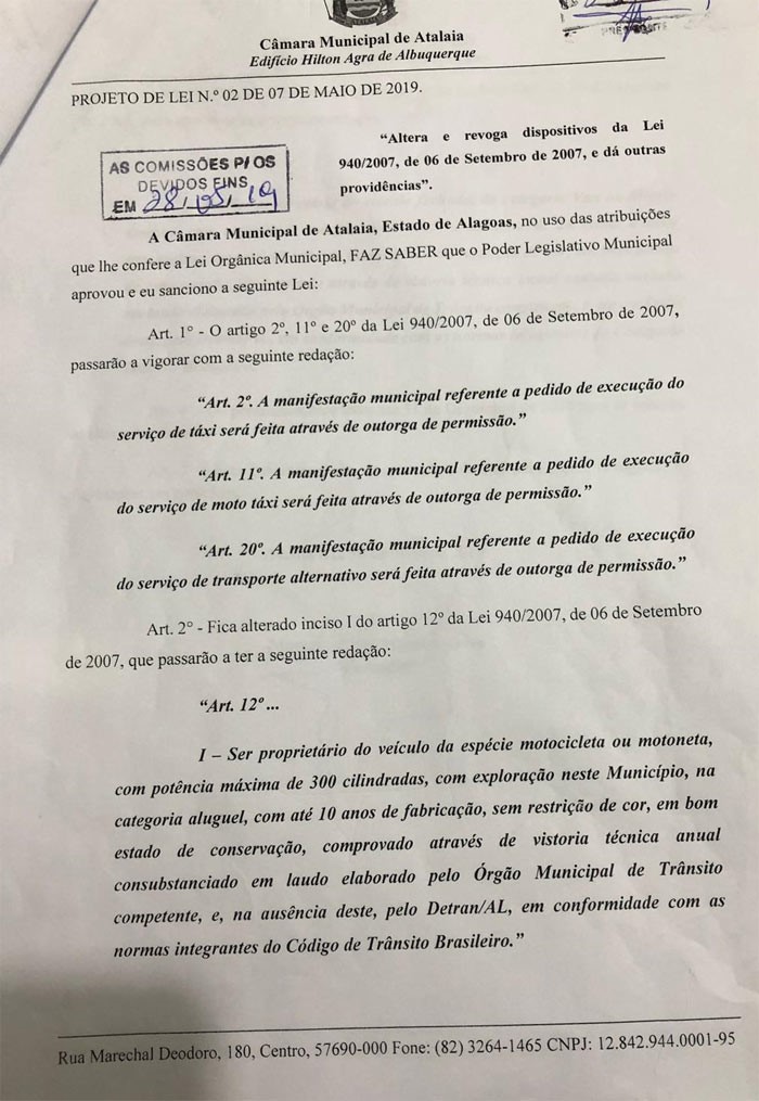 Por unanimidade dos votos dos vereadores presentes a sessão ordinária desta terça-feira (11), foi aprovado em primeiro turno o Projeto de Lei 02/2009, de autoria do vereador Marcos Rebollo, que beneficia a classe dos mototaxistas da cidade de Atalaia.