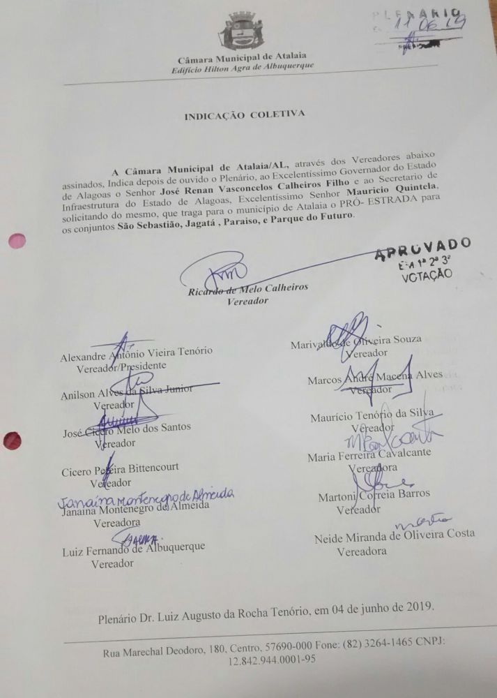 Uma iniciativa do vereador Ricardo Calheiros, solicitando do Governador de Alagoas Renan Calheiros e do Secretário de Infraestrutura do Estado Mauricio Quitella, que tragam para Atalaia o Programa Pró-Estrada, com o intuito de beneficiar os Conjuntos São Sebastião, São Jorge (Jagatá), Parque do Futuro I e Paraíso, ganhou força na sessão ordinária do último dia 04 de junho, resultando em uma Indicação Coletiva assinada e aprovada por todos os vereadores da atual Legislatura.