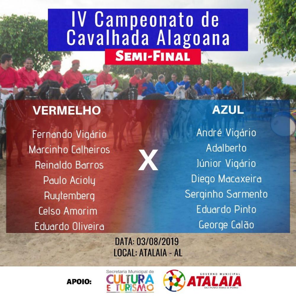 Já neste domingo (4), em Marechal Deodoro, acontece a segunda etapa da semifinal. Atalaia contará com a representação dos Cavalheiros Murillo Vigário, Leonardo Vigário, Luizinho Vigário, Pedro Vitor, Arnon Filho e Aníbal Raposo.