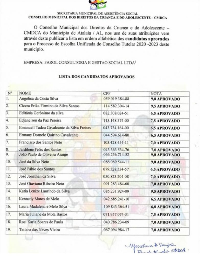 Ao todo, foram aprovados 19 candidatos que obtiveram nota satisfatória para prosseguir para as próximas etapas do Processo de Escolha Unificada do Conselho Tutelar de Atalaia, para o quadriênio 2020 a 2023.